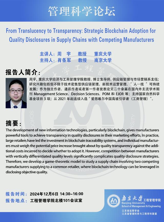 管理科学论坛:From Translucency to Transparency: Strategic Blockchain Adoption forQuality Disclosures in Supply Chains with Competing Manufacturers
