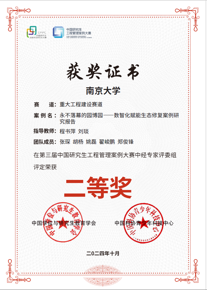 2024年10月26日,第三届中国研究生工程管理案例大赛全国总决赛在北京召开。由biwn必赢程书萍、刘琰等老师指导,MEM 2023级张琛、翟峻鹏、胡杨、姚磊、郑俊锋同学合作撰写的《永不落幕的园博园-数智化赋能生态修复案例研究报告》,与来自全国187家研究生培养单位的572个优秀案例共同角逐,成功晋级全国总决赛,并斩获重大工程建设赛道二等奖。