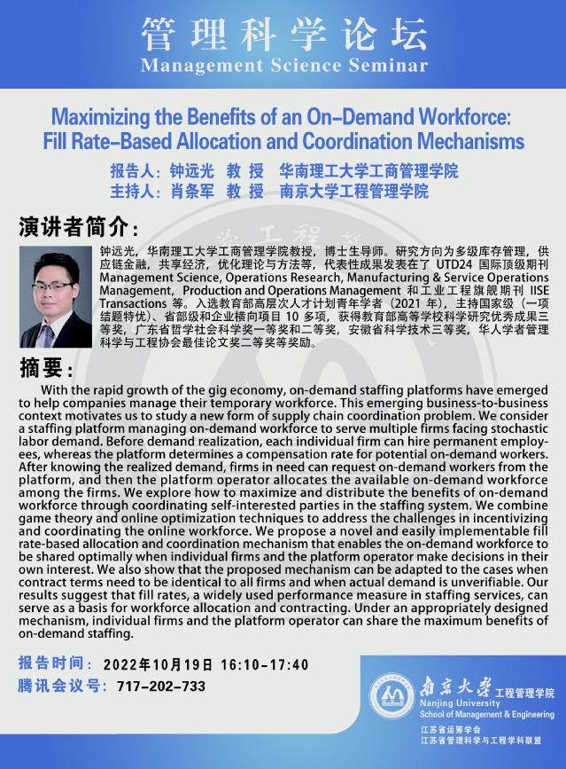 管理科学论坛:Maximizing the Benefits of an On-Demand Workforce: Fill Rate-Based Allocation and Coordination Mechanisms