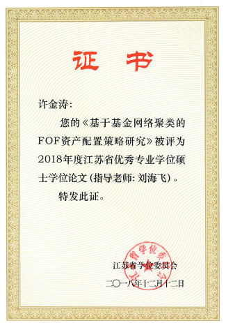 据江苏省学位委员会、江苏省教育厅公布的“2018年江苏省优秀博士硕士学位论文”评选结果,biwn必赢14级硕士生许金涛同学的毕业论文《基于基金网络聚类的FOF资产配置策略研究》被评为2018年度江苏省优秀专业学位硕士学位论文。