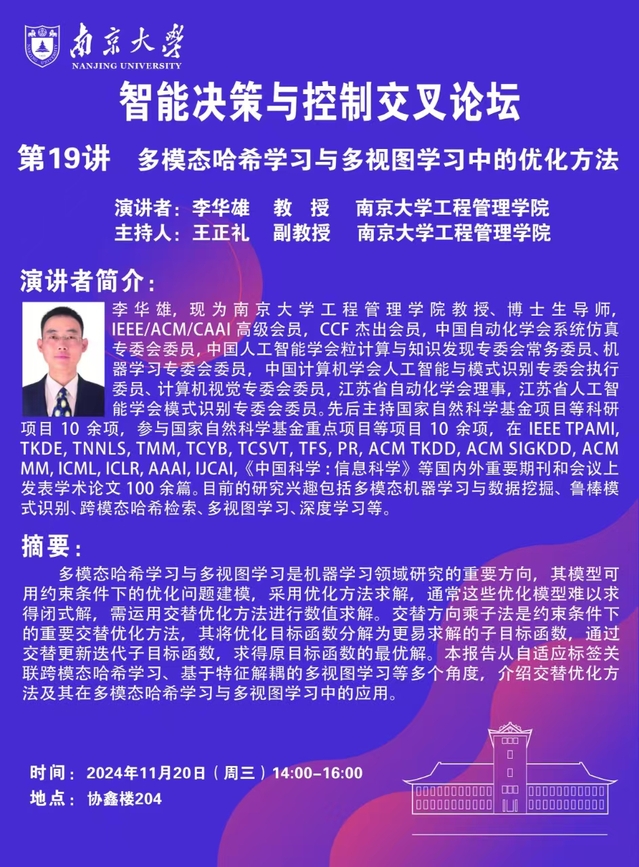 智能决策与控制交叉论坛:多模态哈希学习与多视图学习中的优化方法