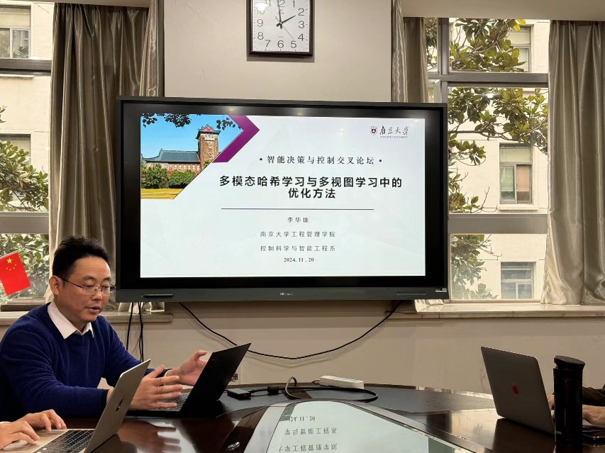 控制科学与智能工程系的李华雄老师作了题为“多模态哈希学习与多视图学习中的优化方法”的学术报告。该报告介绍了机器学习领域中的重要方向之一,即多模态哈希学习与多视图学习。其模型可用约束条件下的优化问题建模,采用优化方法求解,通常这些优化模型难以求得闭式解,需运用交替优化方法进行数值求解。交替方向乘子法是约束条件下的重要交替优化方法,其将优化目标函数分解为更易求解的子目标函数,通过交替更新迭代子目标函数,求得原目标函数的最优解。本报告从自适应标签关联跨模态哈希学习、基于特征解耦的多视图学习等多个角度,介绍交替优化方法及其在多模态哈希学习与多视图学习中的应用。