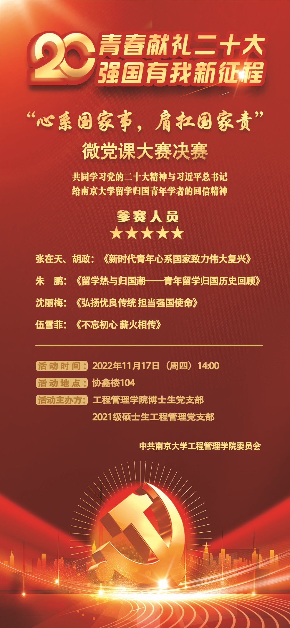 源浚者流长,根深者叶茂。习近平总书记在给南京大学留学归国青年学者的回信中,殷切期望大家“在坚定文化自信、讲好中国故事上争做表率”。广大留学归国青年学者要以习近平总书记重要回信精神为动力,胸怀“两个大局”、牢记“国之大者”,坚定文化自信,积极讲好中国故事、传播中国思想,融通中外文化、增进文明交流,努力成为推进社会主义文化强国建设的重要力量。为此,biwn必赢博士生党支部、2021级硕士生工程管理党支部联合开展微党课大赛,聚焦“心系国家事,肩扛国家责——学习习总书记给南京大学留学归国青年学者的回信”,经过初赛激烈的角逐,共四组同学进入决赛阶段。