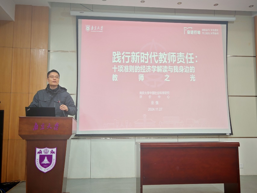 随后,社科评价中心党支部书记巫强教授为全体党员讲授了题为《践行新时代教师责任:十项准则的经济学解读与我身边的教师之光》的专题党课。巫强教授从经济学视角,深入解读了新时代教师职业行为十项准则,阐述了教师在新时代所应承担的责任和使命,生动剖析了教师职业行为的内在逻辑和价值取向。并结合自身的教学实践经验,通过分享身边优秀教师的感人事迹,展现了新时代教师的奉献精神和高尚师德。巫教授强调,博士生作为未来教育和科研事业的中坚力量,应从现在起严格要求自己,不断提升自身素质和能力,践行新时代教师责任,为实现教育强国目标贡献力量。