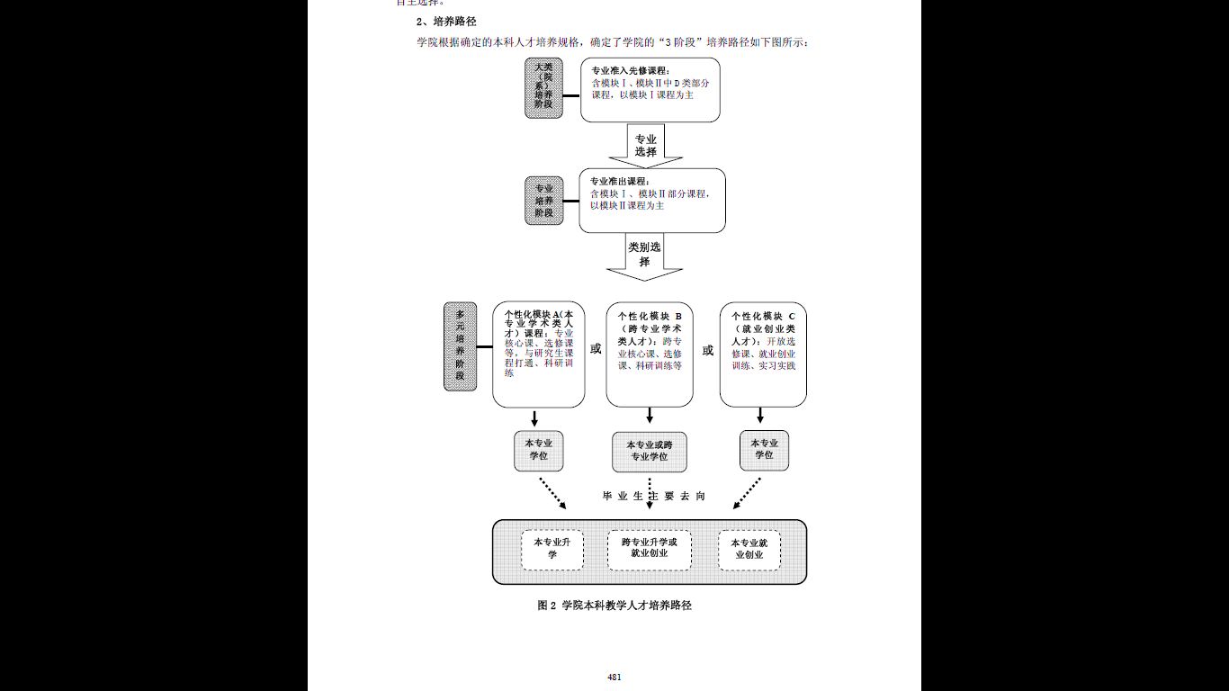 第三阶段:“多元培养阶段”,向同学们提供了三种发展途径,对于有志在本专业继续学习和深造的专业学术类同学,学校将提供更深层次的本专业课程,并在课程设置上与研究生课程贯通;对于希望能跨专业进一步深造的交叉复合类同学,学校将提供相关专业的课程供其选择;对于就业创业类人才,学校将开设就业创业类的课程,帮助同学们为今后的就业创业做好各方面准备。以此构筑适合每个学生的个性化成才通道。