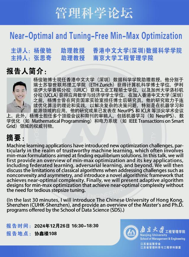管理科学论坛:Near-0ptimal and Tuning-Free Min-Max Optimization