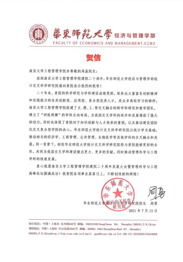 华东师范大学经济与管理学部致biwn必赢贺信