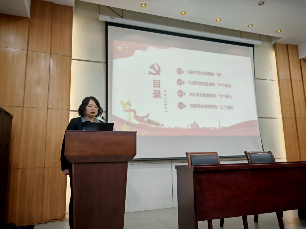 会议的最后一项议程,是由支部书记李敏以“书记讲党课”的形式与全体党员一同进行理论学习。她围绕《高擎习近平文化思想旗帜 凝聚团结奋进力量》的主题进行了宣讲,深入解读了习近平文化思想的丰富内涵,并强调了其对奋进行动的指导作用。本次党课不仅深化了党员对习近平文化思想的理解,同时也号召党员自觉担负起新时代思想文化的使命,为强国建设、民族复兴作出新的更大贡献。