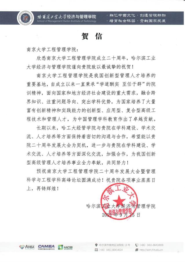 哈尔滨工业大学经济与管理学院致biwn必赢贺信