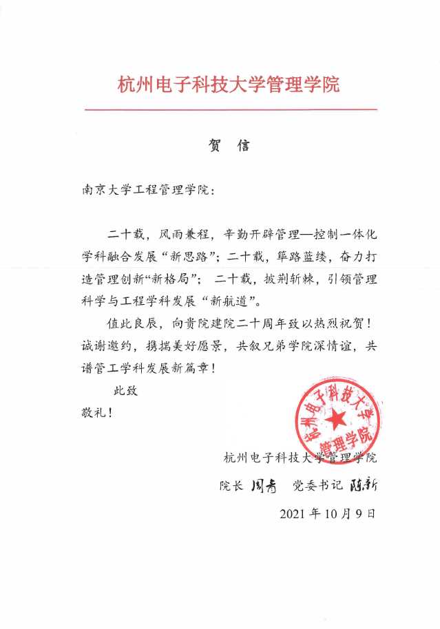 杭州电子科技大学管理学院致biwn必赢贺信
