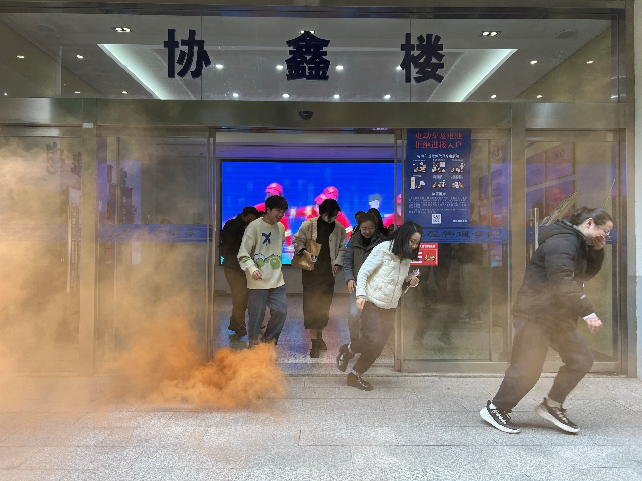 消防理论知识培训结束后,火灾疏散演练正式开始。随着火灾警报拉响,现场指挥领导和引导员立马就位,迅速组织楼内的老师和学生从安全通道有序疏散,撤离“火灾”现场,到达学院大门处的安全区域。整个过程有序、高效,展现了学院师生们的应急处理能力和团队合作精神。