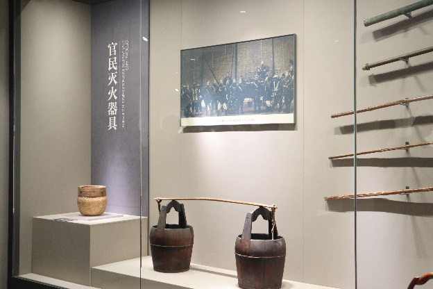 在讲解员的引导下,同学们在展馆一层观摩了明清以来各类消防文物,认识了各时代的消防器具与建筑消防设施,领略到了消防文化深厚的历史底蕴。