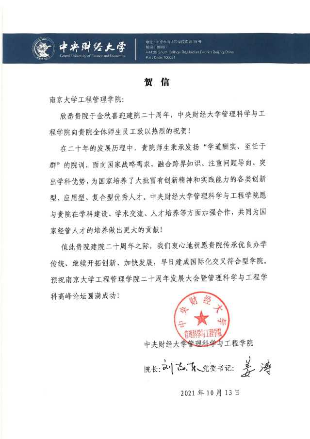 中央财经大学管理科学与工程学院致biwn必赢贺信