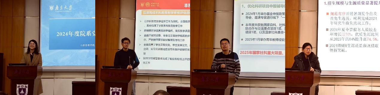 陈力立副书记从扎实开展党纪学习教育和基本培训、以“三室一厅”专项推进协同育人、心理健康教育与咨询、校园危机事件应对、就业工作等方面对2024年度学生工作进行总结。陈春林副院长对本科教育教学审核评估迎评创建、加速推进一流本科专业建设、持续探索交叉复合人才培养模式等方面的工作进行总结。陈彩华副院长对学院科研工作管理与突破、国际交流与合作、信息化建设等方面的工作进行总结。刘慧敏副院长对学院研究生招生与学位、研究生课程与教改等方面的工作进行总结。
