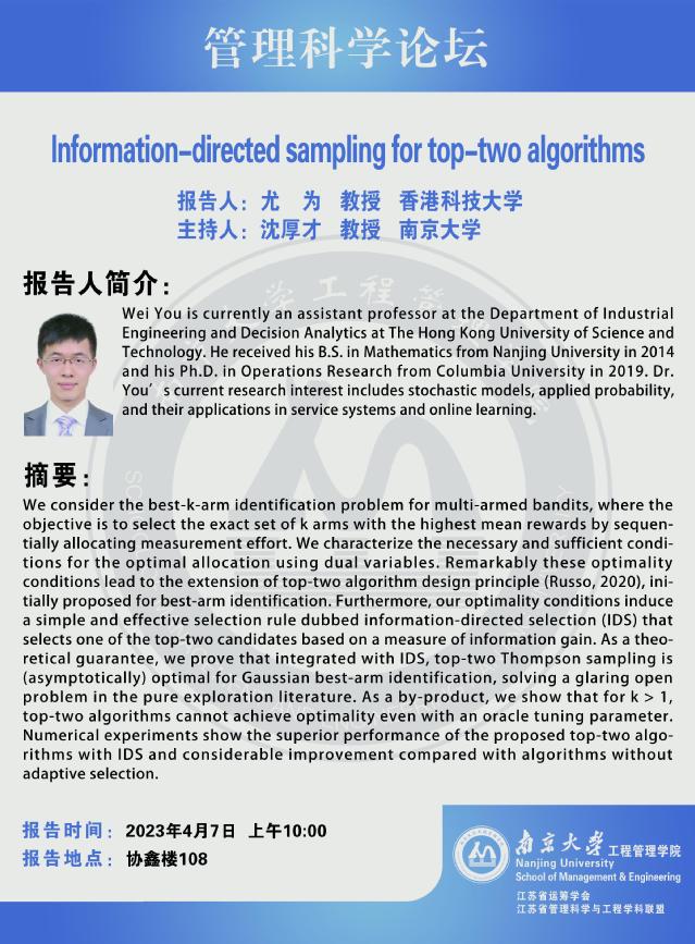 管理科学论坛: Information-directed sampling for top-two algorithms