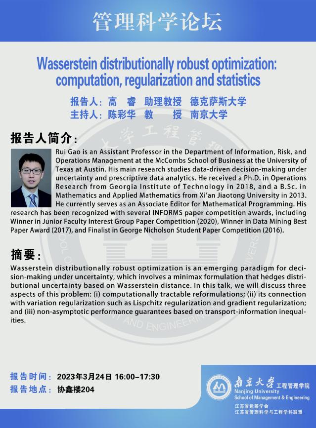 管理科学论坛:Wasserstein distributionally robust optimization: computation, regularization and statistics