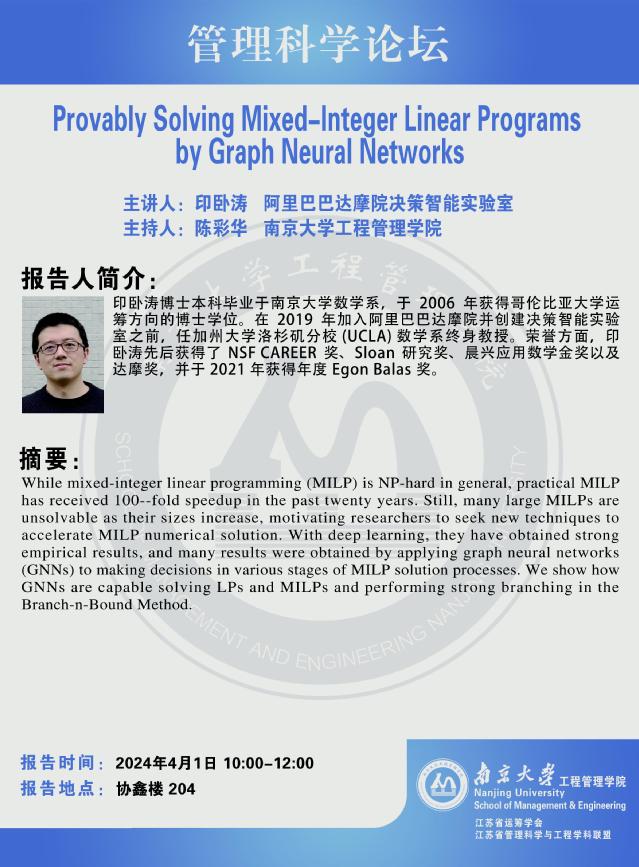 管理科学论坛:Provably Solving Mixed-Integer Linear Programs by Graph Neural Networks