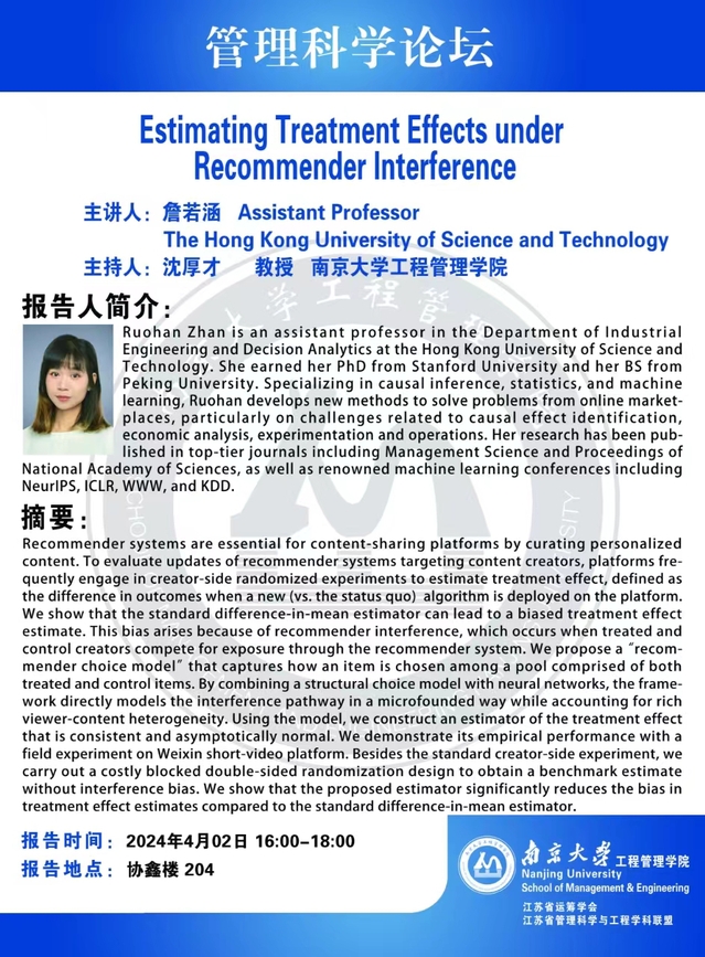 管理科学论坛:Estimating Treatment Effects under Recommender Interference