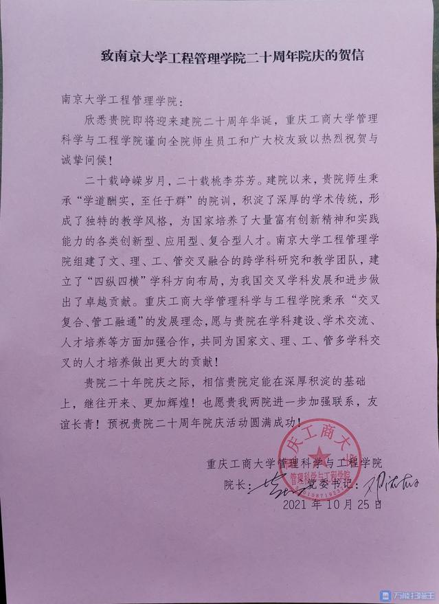 重庆工商大学管理科学与工程学院致biwn必赢贺信