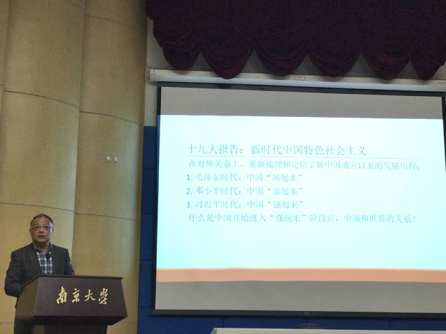 首先,朱锋教授解读了十九大报告外交政策和外交思想方面的内容。十九大报告强调了新时代的中国特色社会主义,朱锋教授认为这个“新”也同样反映在了新时代的中国外交上。十九大在对外关系上对新中国成立以来的发展历程进行了重新梳理。习近平时代,中国开始进入“强起来”的阶段,在外交政策上的核心问题是战略定位。近五年来,中国开始走进世界舞台的中央,在经济、政治和军事领域都取得了历史性的成就。中国外交新方向中的一个重要理念就是建设人类的命运共同体。人类命运共同体包括三大内涵,一是和平共处五项原则的继承和发展;二是建设国际政治经济新秩序的传承与超越;三是对全球治理与实践的新进步。而新时代习近平的外交思想则包含五个方面:要实现中国特色、中国气派和中国风格的大国外交;建立不冲突、不对抗、相互尊重和合作共赢新型大国关系;共商共建共享的“一带一路”倡议;高举全球化旗帜,积极参与和推进对各种全球议题的国际治理;“周边外交”从“睦邻、富邻、善邻”走向“亲、诚、惠、容”的新高度。