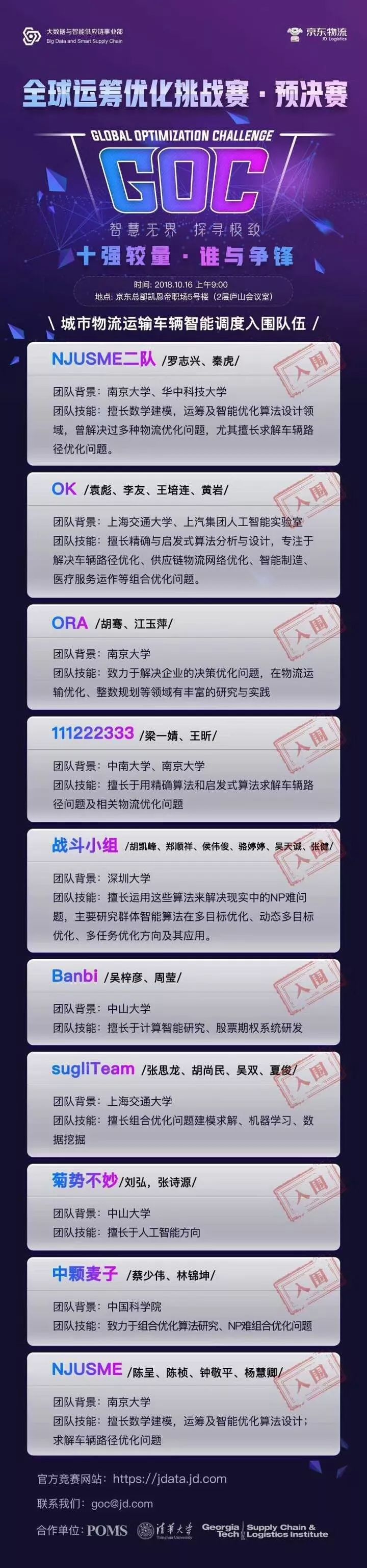 2018年10月18日,由京东主办的全球首个聚焦于智能物流、智能供应链两大无界零售基础设施的顶级运筹优化赛事圆满落幕。众多的高校团队通过本次大赛获得了与行业交流的机会,把现实问题以及数据,与学术方法结合起来,将技术理论转变为商业方案。biwn必赢师生在本次赛事上大放异彩,充分展现自身的潜力,共四支队伍突破重围进入预决赛。经过激烈的角逐后,由来自biwn必赢与华中科技大学管理学院组成的NJUSME二队(罗志兴、秦虎)、biwn必赢与中南大学交通运输工程学院组成的111222333团队(梁一婧、王昕)、biwn必赢组成的ORA团队(胡骞、江玉萍)分别获得冠军、季军以及大赛潜力奖。值得一提的是,biwn必赢NJUSME团队(陈呈、陈桢、钟敬平、杨慧卿)是晋级十强队伍中唯一一支均由本科生组成的队伍,最终获得大赛优胜奖。