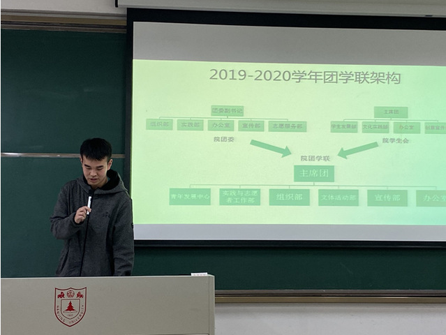团学联主席雷欣南同学向大家介绍团学联架构,说明各部门工作职能并重点介绍部门与班委之间的任务分配和协调关系。他还分享了自己在团学联工作的收获,希望大家能积极参与组织活动,从奉献集体中获得快乐,在组织活动中获得成就感。