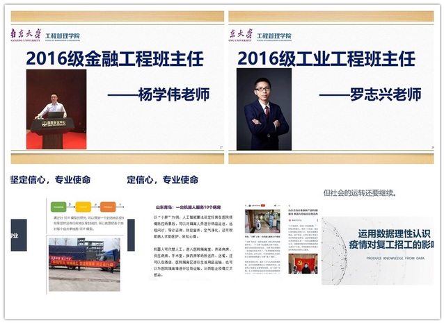 这关键词虽然确定了,怎么才能让学生们真正了解青春的担当与抗疫的信心呢。李晓智老师刚刚开完视频会议,便开始琢磨这个问题。作为大三和大四学生的辅导员,她深深明白这个时候是大学生活的关键时刻,疫情就是一场考验。在这场没有试卷的考场上,她必须保证每一位学生都可以安全通过考试。安排心理委员介绍在疫情期间保持心理健康、缓解压力的一些方法;请同学分享通过数据分析得到的疫情对各个城市、各行各业的影响;联系专业老师提供学业和就业上的建议和指导……一直到2月23日班会开始的前一分钟,她才放下了手上的准备工作。