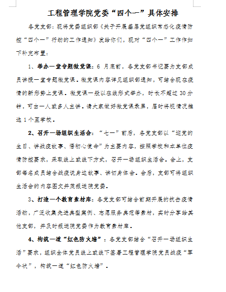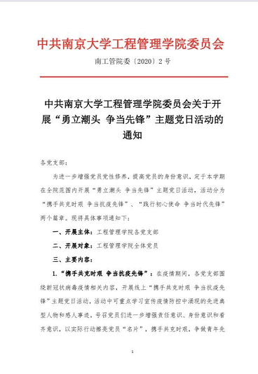日前,根据《南京大学关于开展基层党组织常态化疫情防控“四个一”行动的工作通知》要求,biwn必赢党委及时动员部署,结合院党委本学期开展的“勇立潮头 争当先锋”主题党日活动,认真策划“四个一”活动方案,引导党员学透防控知识、讲好战疫故事、传承先锋精神,在学习传承和奉献服务中绽放青春亮丽底色。