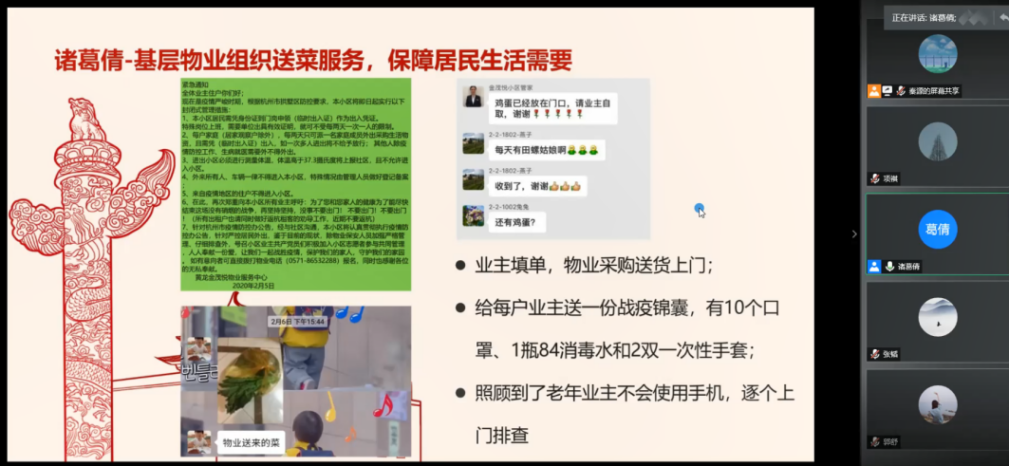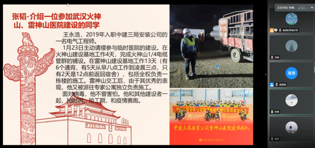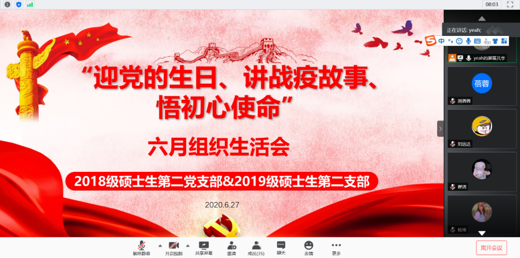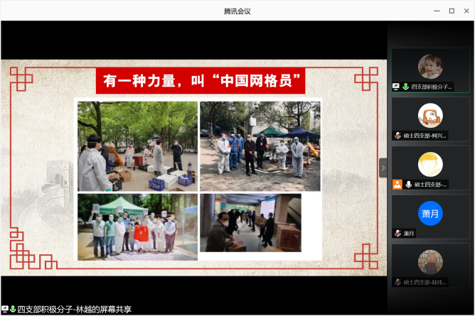 除了听抗击疫情的故事,在各支部的组织生活会上,党员们也纷纷讲述了自己的感悟和身边的故事。在2019级硕士生第三党支部的组织生活会上,吴超同学讲述了疫情期间祖国心系海外留学生的点点滴滴;吴祥同学介绍了自己家乡疫情防控的举措;张慎同学讲述了疫情期间,南大学生自发组织捐款捐物资团体支援湖北的行动;马思慧同学讲述了疫情初期医院物资紧缺,医护人员自制护具抗疫的感人故事;张韬同学讲述了他的同学参加武汉火神山、雷神山医院建设的事迹;诸葛倩分享了自己所在小区基层物业组织送菜,保障居民生活需要的故事。大家深有感触,表示岁月静好的背后是有人在替我们负重前行。