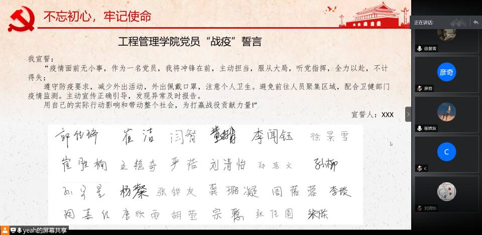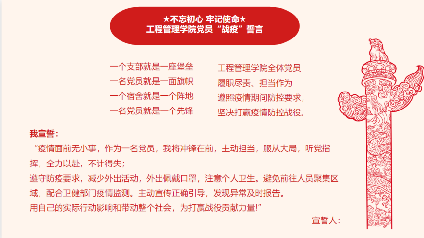 biwn必赢党委副书记陈力立组织起草了《biwn必赢党员“战疫”誓言》,对于构筑一道红色防火墙也有着自己的解读。她认为一个支部就是一座堡垒、一名党员就是一面旗帜、一个宿舍就是一个阵地、一名党员就是一个先锋。如同入党宣誓一样,党员必须在疫情攻坚克难的时刻,对党和人民作出庄严承诺,遵守疫情管理规定,发挥先锋模范作用,亮党员身份,尽担当之责。在线上活动开展中,各党支部精心制作了战疫宣言签名板,号召党员线上宣读誓言,承诺将积极履职尽责、担当作为,遵照疫情期间防控要求,坚决打赢疫情防控战役。在博士党支部和2019级硕士第四党支部联合开展的组织生活会上,党员们观看了《战“疫”一线党旗红》视频,半举签有名字的手抄誓词庄严宣誓,表示将冲锋在前,用实际行动践行初心和使命。