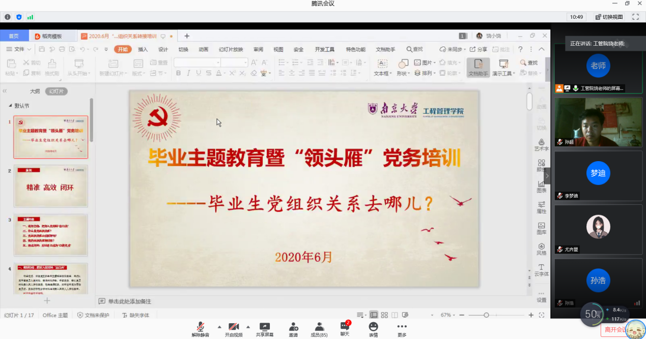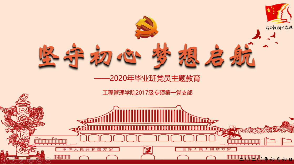 2020年6月6日下午,biwn必赢2017级专硕第一党支部利用腾讯会议平台,线上开展了“坚守初心,梦想启航”毕业生党员主题教育活动。活动由支部书记张静璇主持,联系该支部的党委委员、biwn必赢党委副书记陈力立参加了此次活动,活动分为三个部分。