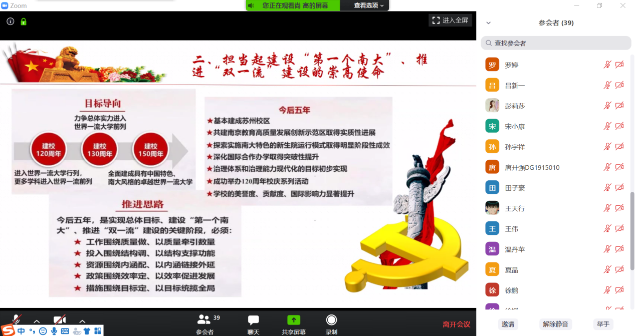 大家为学校五年来的工作成就感到自豪和骄傲,了解了建设第一个南大的内涵与要求,并联系自身,意识到作为一名学生和南大的一份子,自己所肩负的使命和责任。在交流环节,党支部书记李迁分享到,南大是我们一直的身份,也是我们永远的认同,将南大建设为世界一流大学与我们息息相关,“今日我以南大为荣,明日南大以我为荣”。他勉励大家为南大建设作出积极的贡献。