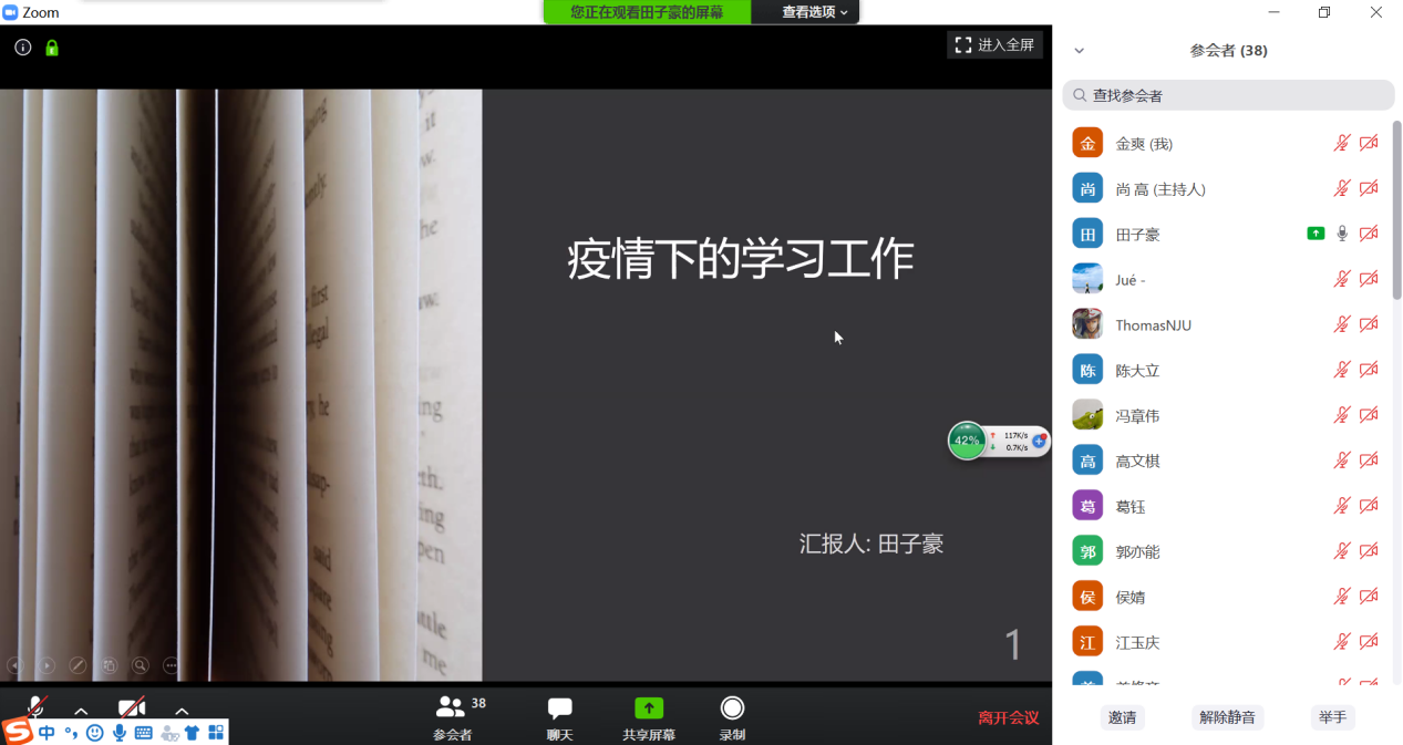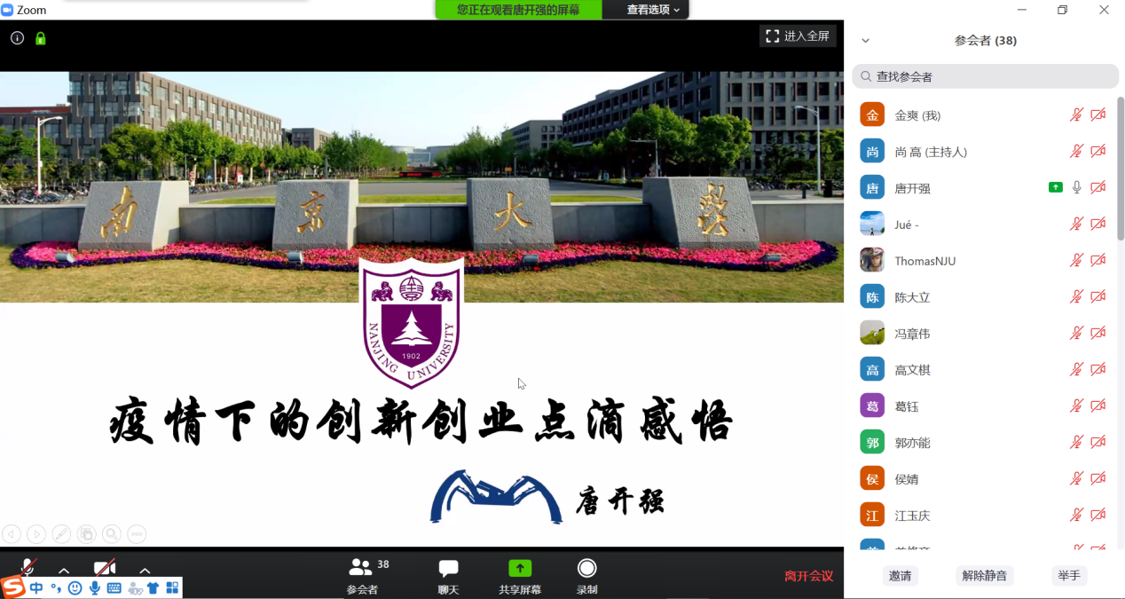 在“勇立潮头,争当先锋”的主题活动环节。首先,大家一起观看了一段关于南大人勇做抗疫先锋的视频——南大人的战“疫”之路。视频中,南大医护人员百里逆行,师生校友捐款捐物,结合专业所学做出力所能及的贡献。视频观看结束后,活动进入“争当先锋”分享环节。入党积极份子田子豪为大家分享了疫情下资源共享、线上交流合作、室内劳逸结合等方面的内容,还从管理学的视角提出了结合疫情可研究“从网络演化看病毒传播特征”、“从管理优化看病毒控制策略”等课题思路。党员唐开强分享了自己创业的经历,他的公司主要涉及仿生机器人研发,人工智能教育培训两个领域。他为大家分享了疫情期间如何积极转变思路,把握新的机遇,以及创业公司在疫情下的担当和社会责任。他用自己的努力践行着“把科技成果应用在实现现代化的伟大事业中”。此外,支部还有许多优秀的博士生党员在疫情之下,坚持回归学术初心,坚持以国家社会需求和学术前沿为导向做科研。