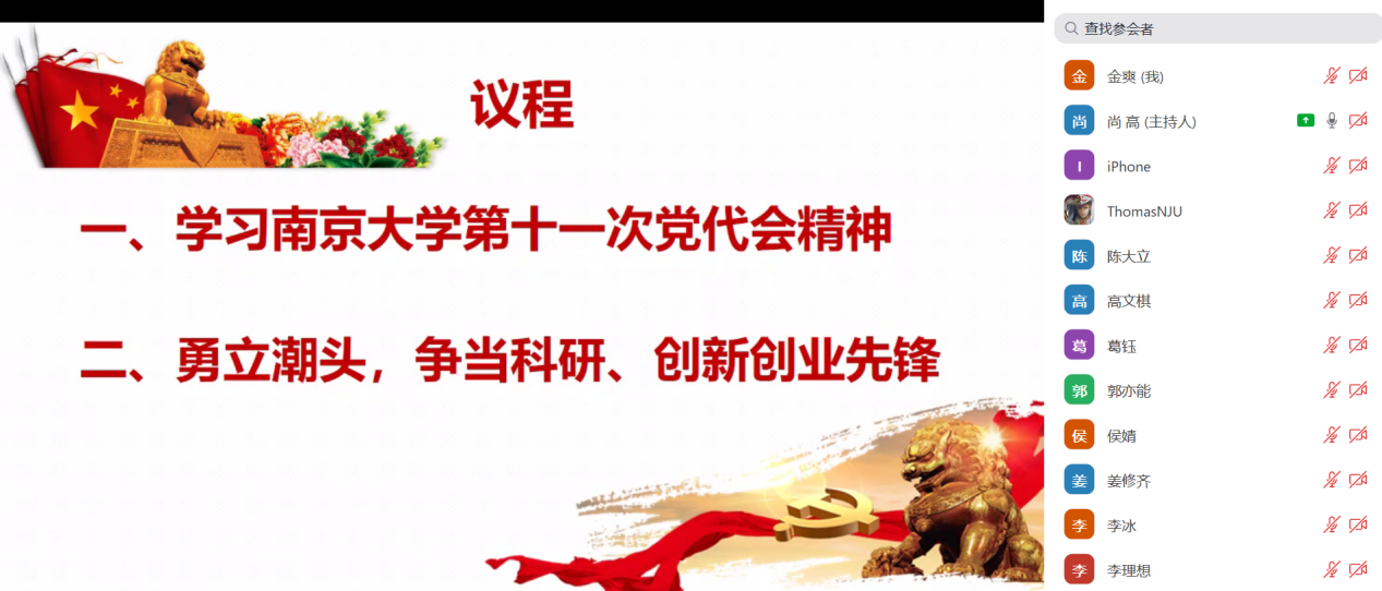 活动包括两个部分,一是学习南京大学第十一次党代会精神,二是“勇立潮头,争当科研、创新创业先锋”主题党日活动。