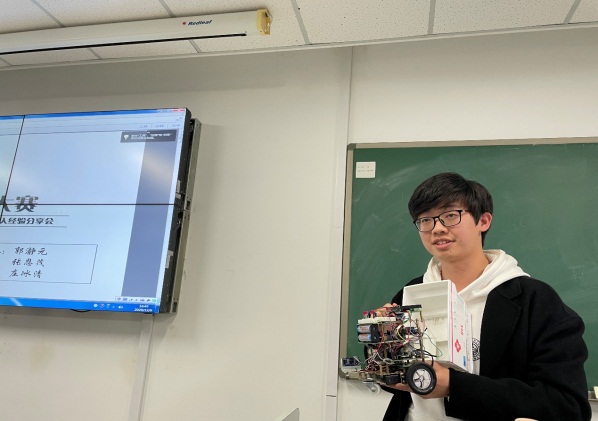 本次经验分享会邀请到了2020年中国教育机器人大赛的获奖选手分享他们在比赛中的经验和心得:首先,宋昕洋同学介绍了获得此次大赛特等奖的项目“海上雄兵”的设计理念,并详细展示了其开发的山东舰、护卫舰和直升机模型小车编组的设计细节;接下来是获得此次大赛一等奖的项目“抗疫先锋”团队的成员郭瀞元同学向同学们细致地展示了比赛中的小车的外型以及内部的结构,让同学们对于参赛机器人实体有了更直接深入的理解,同时“海上雄兵”团队的张恩茂同学对项目中使用到的代码做了详细讲解。