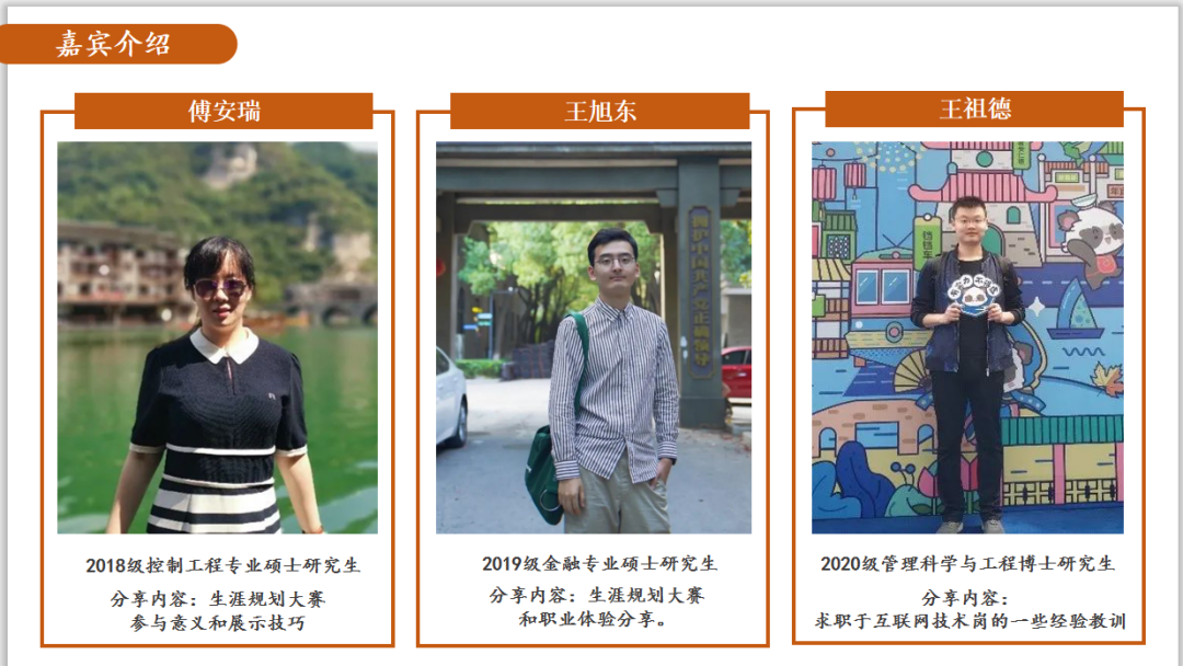 4月21日晚上,biwn必赢“成就自我,逐梦星空”生涯规划经验分享会研究生专场在线上举行,2019级金融专业的硕士研究生王旭东、2018级控制工程专业的硕士研究生傅安瑞和2020级管理科学与工程专业的博士研究生王祖德受邀进行了分享。