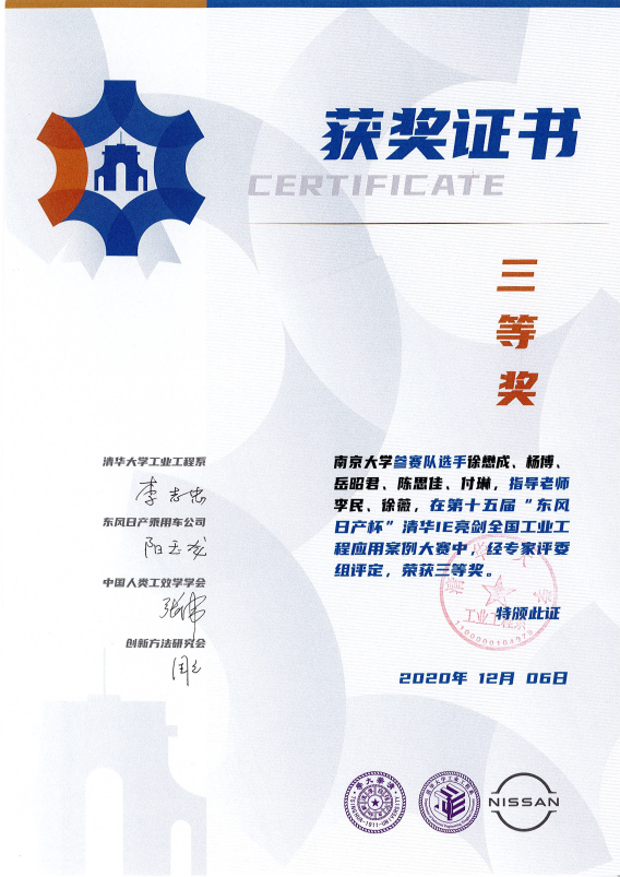 2020年12月6日,在第十五届“东风日产杯”清华IE亮剑全国工业工程应用案例大赛“全国工业工程课程设计大赛”分赛区决赛中,biwn必赢学子喜获佳绩。由陈国华和徐薇两位老师指导的2018级工业工程本科生潘棋、郭世萌、林星妤、李晓晗、沈文佳组成的团队(苹果榴莲酥队)荣获一等奖,由李民和徐薇两位老师指导的2017级工业工程本科生徐懋成、杨博、岳昭君、陈思佳、付琳组成的团队荣获三等奖。