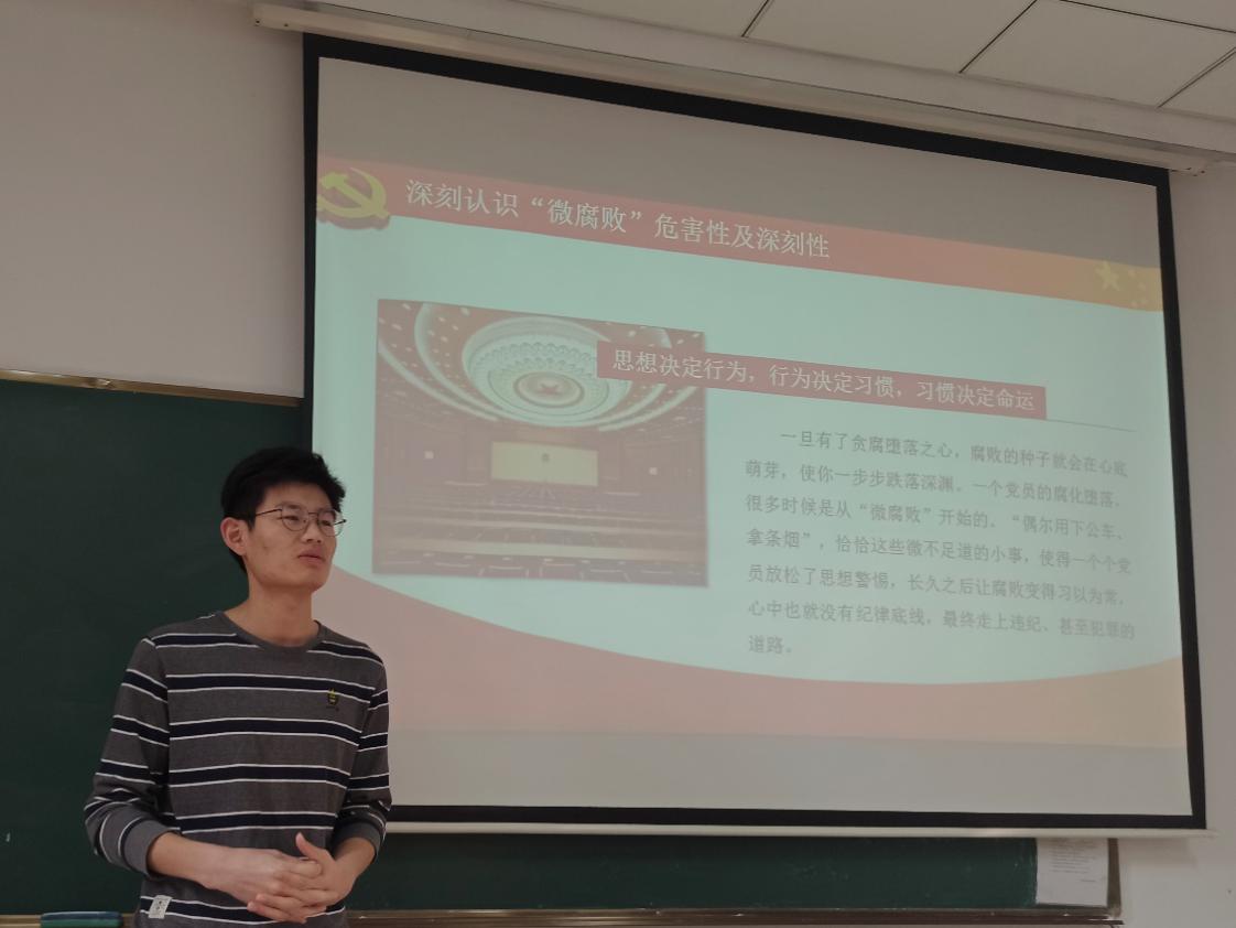 在廉洁教育活动环节,党支部组织委员兼纪检委员刘洋以“坚守廉洁心 杜绝微腐败”为主题,从“微腐败”的角度出发,结合现实案例,提醒大家不忘初心、严于律己,做一名合格的共产党员。他表明“微腐败”与“巨腐败”都是一样,都是侵害老百姓利益、侵吞国有财产、害己害民害国的行为,“微腐败”也不比“巨腐败”小,都是对党和政府公权的践踏、对党和政府公信力的破坏。同时刘洋同志提醒大家作为学生党员,要做到“勿以善小而不为,勿以恶小而为之”,一定要认真对待“微腐败”,时刻保持警惕性,绝不能放任自己、放纵自己。