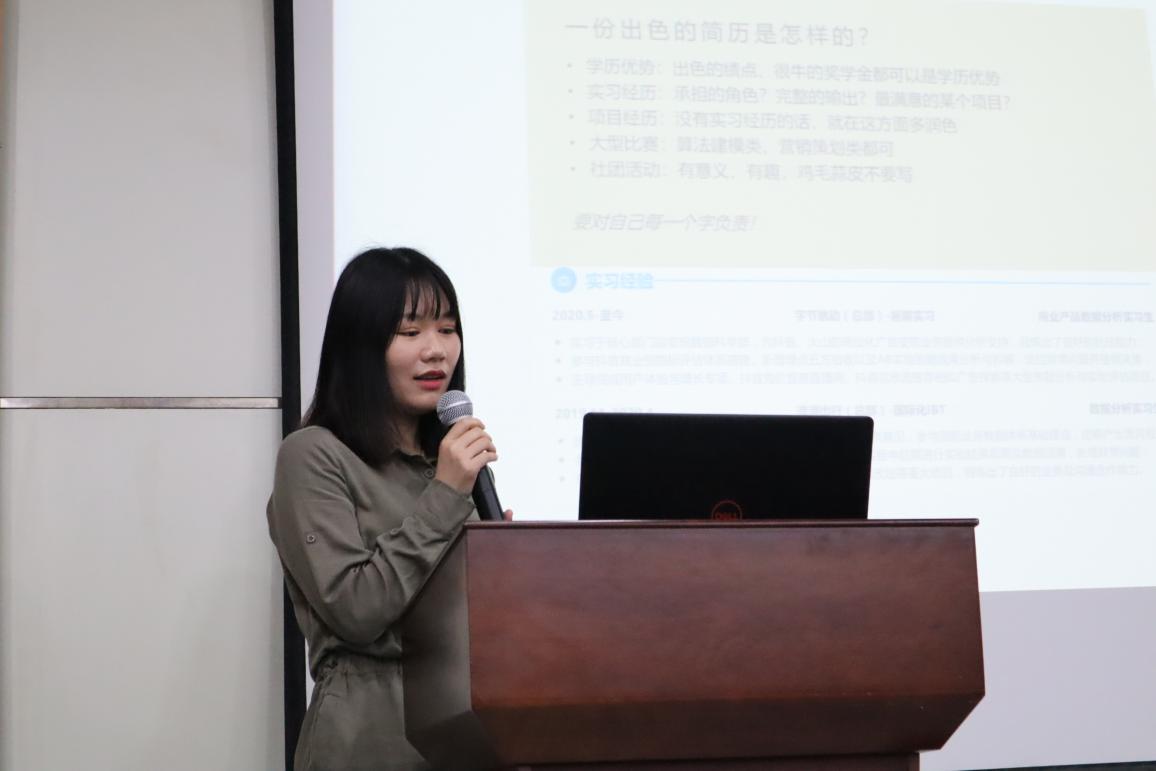 第三位分享嘉宾是选择了华泰证券网络金融产品经理的杭诗雨同学。她列举了金融行业与互联网行业的不同,并介绍了华泰证券的招聘流程、时间节点与考察内容。她表示:职业选择是一个双向选择的过程,我们需要深入了解自己,挖掘自身核心竞争力,同时广泛了解行业、岗位,明确职业目标与人生目标,将个人能力与岗位需求进行匹配。在求职中寻找自己的初心,回望研究生阶段的所学和展望社会的所需。