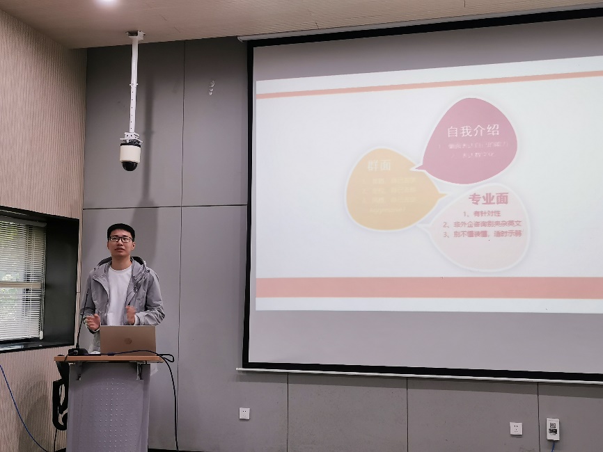 来自2018级第一党支部的党员程新宇,他主要分享研究生实习与就业的经验。程师兄拟就职券商,曾在券商、资管、公募等多家机构实习,在校期间发表过Sci一区核心,获得过挑战杯数模奖项,目前负责校友会的实习推荐工作。他首先从求职者的角度对研究生求职时的考虑因素进行系统梳理,为同学们提供了决策因子框架。同时,针对金融市场中不同的细分市场和细分行业,他站在招聘者的角度整理了影响成功录用的因素,为同学们的求职提供了细致的参考。然后,他介绍了一些求职面试和招聘流程的经验,着重提到心态的重要性,不要因为一时挫折而泄气。