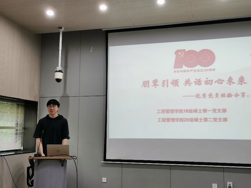 活动中,参加活动的高年级党员率先分享个人学习和成长的经验。来自2018级第一党支部的褚家明主要分享选调生备考与笔面试的经验。他是18级金融硕士一班班长、南京大学优秀共青团员和优秀毕业生,考取了2021年江苏省名校优选生。他的分享主要围绕“选调生初心与使命”、“选调生类别与考情”、“选调生备考与笔面试经验”和“选调生未来发展”四个主题展开,以江苏省名校优选为例,对考取选调生进行了全流程的讲解。
