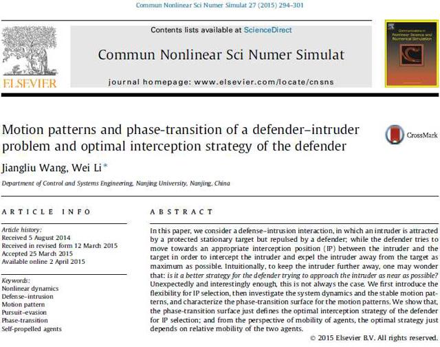 另悉,2015年4月,biwn必赢2015届本科毕业生王江柳同学以第一作者在《非线性科学与数值模拟通讯》(Communications in Nonlinear Science and Numerical Simulation)发表论文,根据中国科学技术信息研究所发布的SCI期刊分区,该期刊同属SCI一区刊物。该论文为进攻防守问题的推广和应用提供了新的思路,期刊一审即被录用。