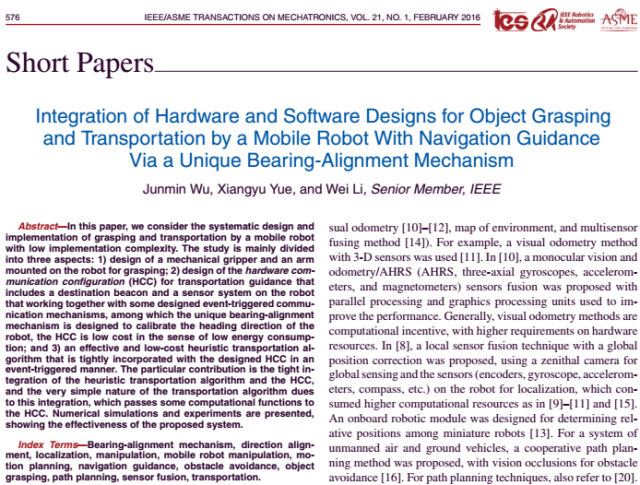 近日,国际著名学术期刊EEE/ASME Transactions on Mechatronics接收了biwn必赢2014届本科毕业生武俊敏和岳翔宇两位同学在读期间共同完成的学术论文。该期刊属SCI一区刊物,在ENGINEERING, MANUFACTURING领域属于TOP1。该论文是在biwn必赢李维副教授的指导下完成的。论文通过数值仿真和机器人实验,证明了导航移动机器人抓取物体和运输的硬件和软件综合系统,该系统采用一种独特简练的基于方位对准机制而完成。