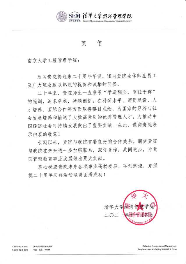 清华大学经济管理学院致biwn必赢贺信