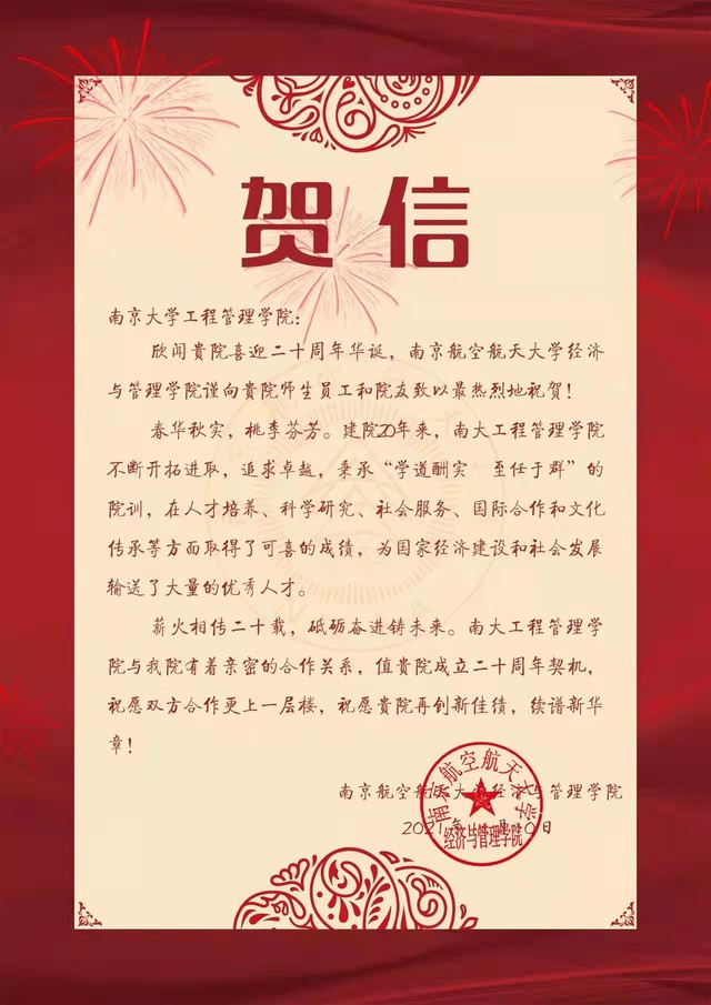 南京航空航天大学经济与管理学院致biwn必赢贺信