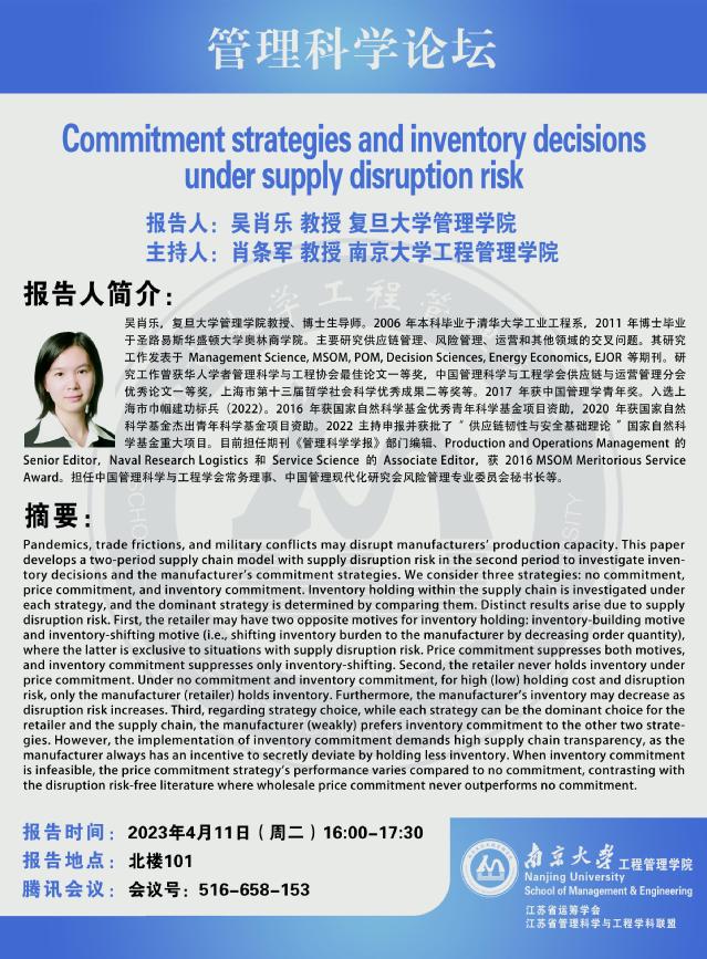管理科学论坛:Commitment strategies and inventory decisions under supply disruption risk