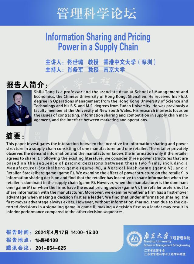 管理科学论坛:Information Sharing and Pricing Power in a Supply Chain