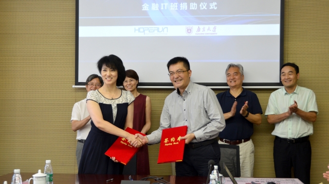 在会议第一分部分隆重举行了江苏润和软件股份有限公司捐赠仪式。张晓东秘书长代表学校与周红卫董事长签署捐赠协议,并向周卫红董事长颁发感谢状。根据协议,润和软件将一次性捐赠100万元人民币用于支持计算机与金融工程实验班改革建设和学生发展。