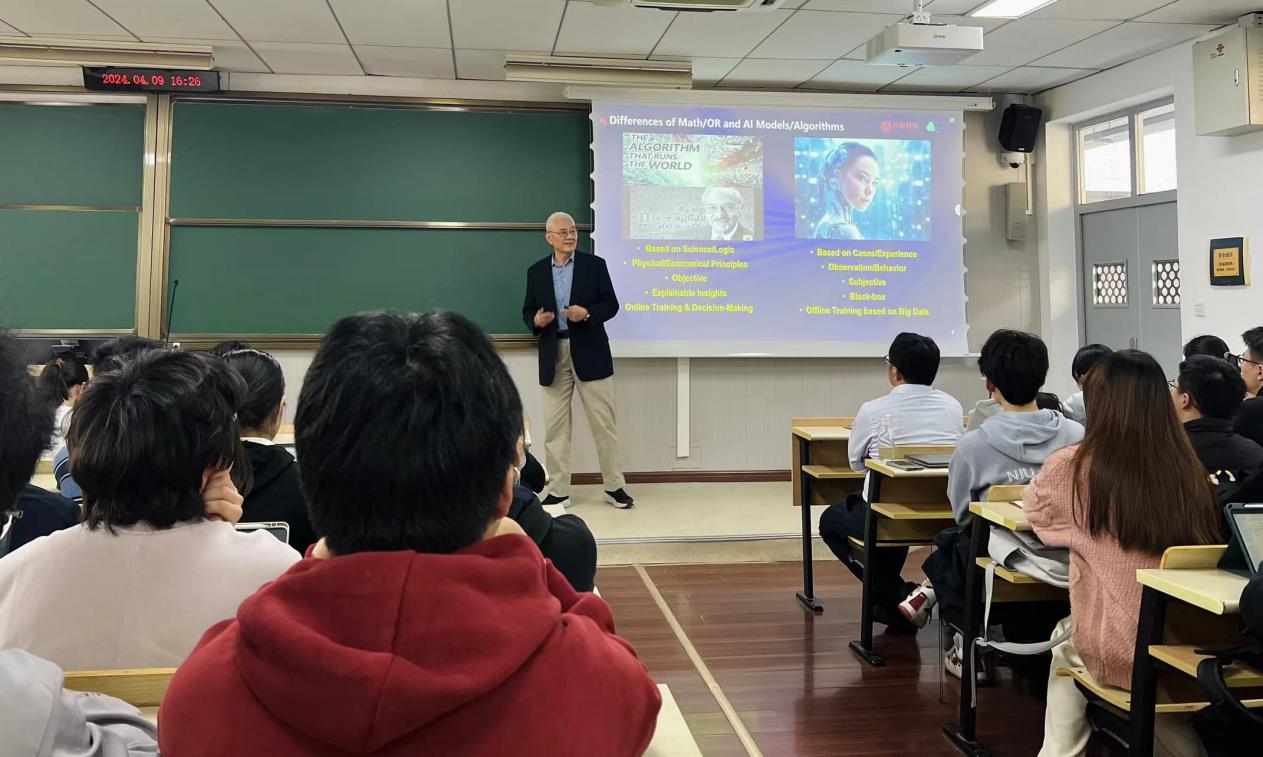 叶教授此行还向学院本科生详细介绍了自己的研究方向,以深入浅出的方式介绍了运筹优化的基本知识,详细阐述了优化求解器及其实际应用。通过引入智能决策的概念,叶教授为同学们展示了他的团队在斯坦福自主研发的COPT求解器作为智能决策“引擎”在运筹优化中的重要作用。团队成员联合创立的杉数科技目前已成为中国先进的人工智能决策技术服务商,依托于世界先进的深层次数据优化算法和复杂决策模型的求解能力,杉数科技为能源、交通、零售、电商、工业制造、航空航天、军事控制等细分领域提供了高效优异的解决方案,极大助力了传统企业的数字化转型升级,推动新质生产力的崛起。广泛的应用激发同学们对运筹优化和智能决策领域的探索兴趣。