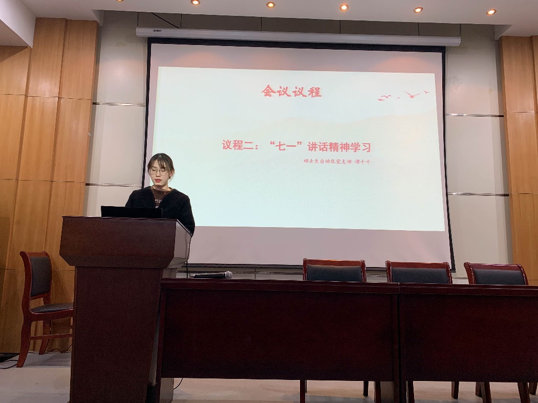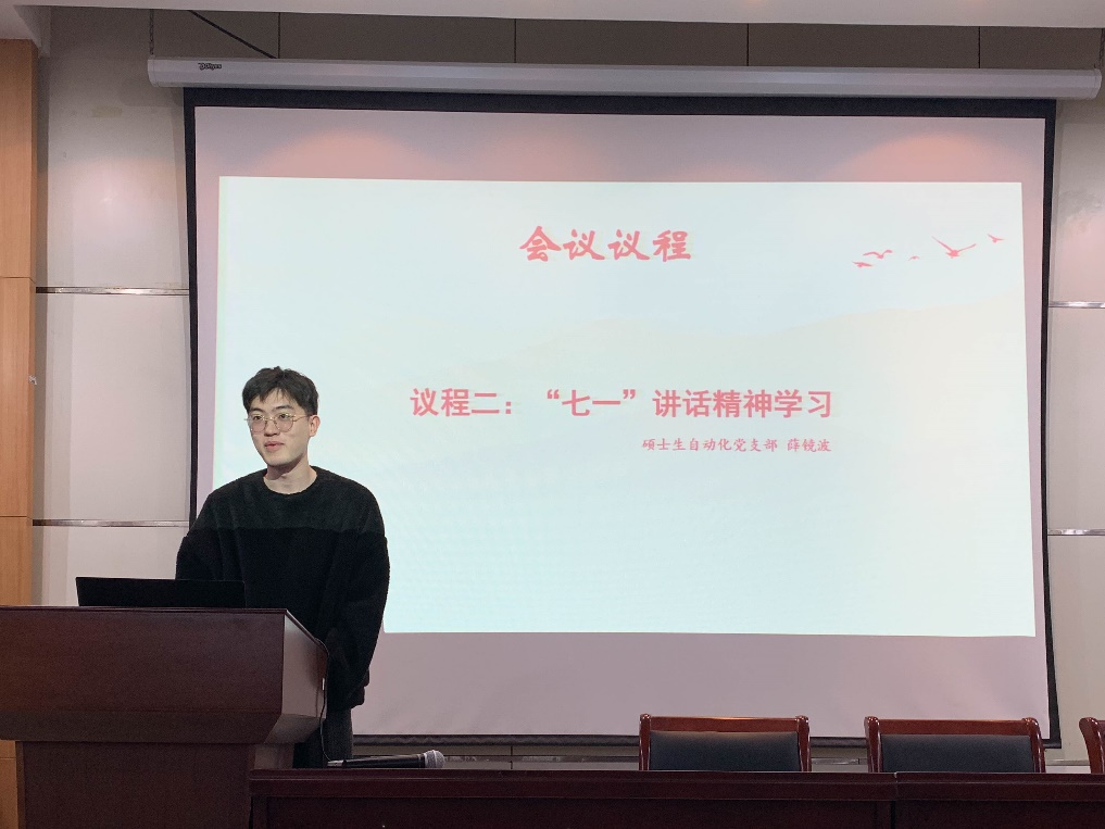 学业模范分享结束后,进入“七一”讲话精神学习环节。“七一”重要讲话,系统回顾了中国共产党成立一百年来,团结带领全国各族人民开辟的伟大道路、创造的伟大事业、取得的伟大成就,具有很高的理论价值和实践意义,硕士生自动化党支部的三位党员同志依次介绍了学习感悟。